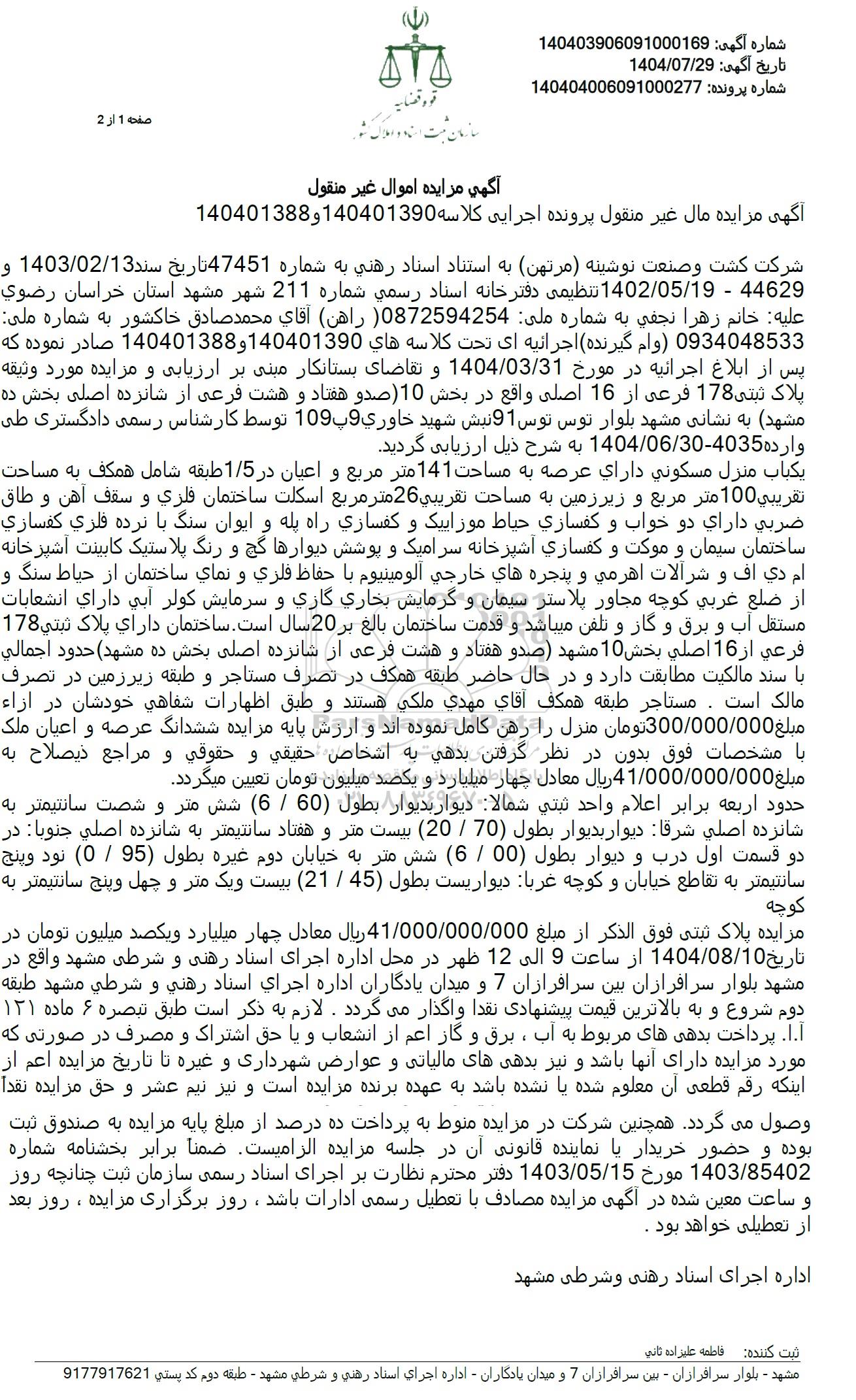 شرکت کشت و صنعت نوشینه (مرتهن) به استناد اسناد رهنی به شماره 47451 تاریخ سند 1403.02.13 و 44629 - 1402.05.19 تنظیمی دفترخانه اسناد رسمی شماره 211 شهر مشهد استان خراسان رضوی علیه خانم زهرا نجفی به شماره ملی 0872594254 ( راهن) آقای محمد صادق خاکشور به شماره ملی 0934048533 وام گیرنده اجرائیه ای تحت کلاسه های 140401390 و 140401388 صادر نموده که پس از ابلاغ اجرائیه در مورخ 1404.03.31 و تقاضای بستانکار مبنی بر ارزیابی و مزایده مورد وثیقه پلاک ثبتی 178 فرعی از 16 اصلی واقع در بخش 10 صدو هفتاد و هشت فرعی از شانزده اصلی بخش ده مشهد به نشانی مشهد بلوار توس توس 91 نبش شهید خاوری 9 پ 109 توسط کارشناس رسمی دادگستری طی وارده 4035-1404.06.30 به شرح ذیل ارزیابی گردید.