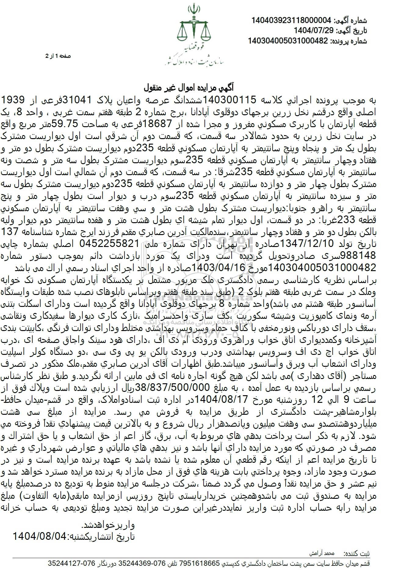به موجب پرونده اجرائي كلاسه 140300115 ششدانگ عرصه و اعیان پلاک 31041 فرعی از 1939 اصلی واقع در قشم نخل زرین برجهای دوقلوی آپادانا ، برج شماره 2 طبقه هفتم سمت غربی ، واحد 8 یک قطعه آپارتمان با کاربری مسکونی مفروز و مجزا شده از 18687 فرعی به مساحت 59.75 متر مربع واقع در سایت نخل زرین به حدود شمالا در سه قسمت که قسمت دوم آن شرقی است اول دیواریست مشترک بطول یک متر و پنجاه و پنج سانتیمتر به آپارتمان مسکونی قطعه 235 دوم دیواریست مشترک بطول دو متر و هفتاد و چهار سانتیمتر به آپارتمان مسکونی قطعه 235 سوم دیواریست مشترک بطول سه متر و شصت و نه سانتیمتر به آپارتمان مسکونی قطعه 235 شرقا در سه قسمت که قسمت دوم آن شمالی است اول دیواریست مشترک بطول چهار متر و دوازده سانتیمتر به آپارتمان مسکوني قطعه 235 دوم دیواریست مشترک بطول سه متر و سیزده سانتیمتر به آپارتمان مسکوني قطعه 235 سوم درب و دیوار است بطول چهار متر و پنج سانتیمتر به راهرو جنوبا دیواریست مشترک بطول هشت متر و سی و هفت سانتیمتر به آپارتمان مسکونی قطعه 233 غربا در دو قسمت اول دیوار تمام شيشه اي بطول هشت متر و هفده سانتیمتر دوم دیوار ولبه بالكن بطول دو متر و هفتاد و چهار سانتیمتر سند مالکیت آدرین صابری مقدم فرزند ایرج شماره شناسنامه 137 تاریخ تولد 1347.12.10 صادره از تهران دارای شماره ملی 0452255821 اصلی بشماره چاپی 988148 سری صادر و تحویل گردیده است و درای یک مورد بازداشت دائم بموجب دستور شماره 140304005031000482 مورخ 1403.04.16 صادره از واحد اجرای استاد رسمی اراک می باشد