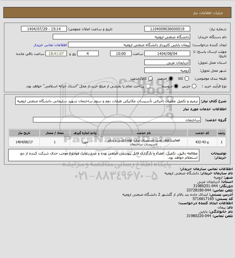 شرح کلی نیاز: ترمیم و تکمیل عملیات اجرائی تأسیسات مکانیکی طبقات دوم و سوم ساختمان شهید سلیمانی دانشگاه صنعتی ارومیه