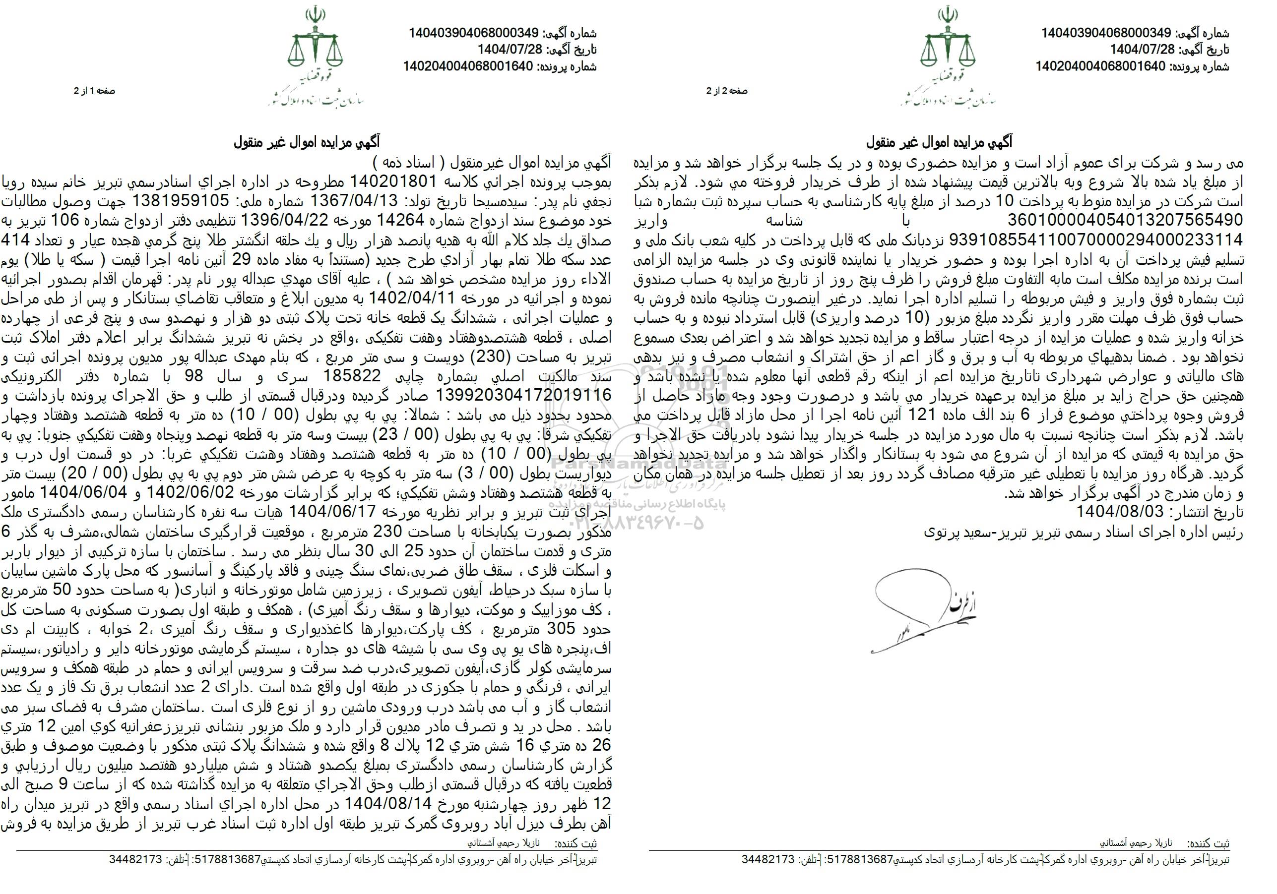 بموجب پرونده اجرائي كلاسه 140201801 مطروحه در اداره اجرای اسنادرسمی تبریز خانم سیده رویا نجفی نام پدر سید مسیحا تاریخ تولد : 1367/04/13 شماره ملی : 1381959105 جهت وصول مطالبات واریز خود موضوع سند ازدواج شماره 14264 مورخه 1396/04/22 تنظیمی دفتر ازدواج شماره 106 تبریز به صداق يك جلد كلام الله به هدیه پانصد هزار ریال و یک حلقه انگشتر طلا پنج گرمي هجده عيار و تعداد 414 عدد سکه طلا تمام بهار آزادی طرح جدید مستندا به مفاد ماده 29 آئین نامه اجرا قیمت ) سکه با طلا بوم الاداء روز مزایده مشخص خواهد شد ) ، علیه آقای مهدی عبداله پور نام پدر قهرمان اقدام بصدور اجرائیه نموده و اجرائیه در مورخه 1402.04.11 به مدیون ابلاغ و متعاقب تقاضاي بستانکار و پس از طی مراحل و عملیات اجرائی، ششدانگ یک قطعه خانه تحت پلاک ثبتی دو هزار و نهصد و سی و پنج فرعی از چهارده اصلی، قطعه هشتصد و هفتاد و هفت تفكيكي واقع در بخش به تبریز ششدانگ برابر اعلام دفتر املاک ثبت تبریز به مساحت (230) دویست و سی متر مربع که بنام مهدی عبداله پور مدیون پرونده اجرائی ثبت و سند مالکیت اصلی بشماره چاپی 185822 سری و سال 98 با شماره دفتر الکترونیکی 139920304172019116 صادر گردیده و در قبال قسمتی از طلب و حق الاجرای پرونده بازداشت و محدود بحدود ذیل می باشد: شمالا پی به بي بطول (00 / 10) ده متر به قطعه هشتصد و هفتاد و چهار تفكيكي شرقا پي به بي بطول 00 / (23) بیست و سه متر به قطعه نهصد و پنجاه و هفت تفكيكي جنوبا يي به بي بطول 00 / (10) ده متر به قطعه هشتصد و هفتاد و هشت تفکیکی غربا در دو قسمت اول درب و دیواریست بطول (00 / (3) سه متر به کوچه به عرض شش متر دوم پی به پی بطول (00 / 20) بیست متر به قطعه هشتصد و هفتاد و شش تفکيکي که برابر گزارشات مورخه 1402.06.02 و 1404.06.04 مامور اجرای ثبت تبریر و برابر نظریه مورخه 1404.06.17 هیات سه نفره کارشناسان رسمی دادگستری ملک مذکور بصورت یکتابخانه با مساحت 230 متر مربع موقعیت قرارگیری ساختمان شمالی مشرف به گذر 6 متری و قدمت ساختمان آن حدود 25 الى 30 سال بنظر می رسد. ساختمان با سازه ترکیبی از دیوار باربر و اسکلت فلزی ، سقف طاق ضربی نمای سنگ چینی و فاقد پارکینگ و آسانسور که محل پارک ماشین سایبان با سازه سبک در حیاط ایفون تصویری زیر زمین شامل موتورخانه و انباری به مساحت حدود 50 متر مربع کف موزاییک و موکت دیوارها و سقف رنگ امیزی همکف و طبقه اول بصورت مسکونی به مساحت کل حدود 305 متر مربع، کف پارکت دیوارها کاغذ دیواری و سقف رنگ آمیزی 2 خوابه ، کابینت ام دی اف پنجره های یو پی وی سی با شیشه های دو جداره، سیستم گرمایشی موتورخانه دایر و رادیاتور سیستم سرمایشی کولر گازی ایفون تصویری درب ضد سرقت و سرویس ایرانی و حمام در طبقه همکف و سرویس ایرانی ، فرنگی و حمام با جکوزی در طبقه اول واقع شده است. دارای 2 عدد انشعاب برق تک فاز و یک عدد انشعاب گاز و آب می باشد درب ورودی ماشین رو از نوع فلزی است. ساختمان مشرف به فضای سبز می باشد. محل در بد و تصرف مادر مدیون قرار دارد و ملک مزبور بنشانی تبریز زعفرانیه کوي امين 12 متري 26 ده متري 16 شش متري 12 بلاك 8 واقع شده و ششدانگ پلاک ثبتی مذکور با وضعیت موصوف و طبق گزارش کارشناسان رسمی دادگستری بمبلغ یکصد و هشتاد و شش میلیارد و هفتصد میلیون ریال ارزیابی و قطعیت یافته که در قبال قسمتى از طلب وحق الاجرای متعلقه به مزایده گذاشته شده که از ساعت 9 صبح الی 12 ظهر روز چهارشنبه مورخ 1404.08.14 در محل اداره اجرای اسناد رسمی واقع در تبریز میدان راه اهن بطرف دیزل آباد روبروی گمرک تبریز طبقه اول اداره ثبت استاد غرب تبریز از طریق مزایده به فروش می رسد و شرکت برای عموم آزاد است و مزایده حضوری بوده و در یک جلسه برگزار خواهد شد و مزایده 360100004054013207565490 し از مبلغ یاد شده بالا شروع و به بالاترین قیمت پیشنهاد شده از طرف خریدار فروخته می شود. لازم بذکر است شرکت در مزایده منوط به پرداخت 10 درصد از مبلغ پایه کارشناسی به حساب سپرده ثبت بشماره شبا شناسه 939108554110070000294000233114 نردبانک ملی که قابل پرداخت در کلیه شعب بانک ملی و تسلیم فیش پرداخت 