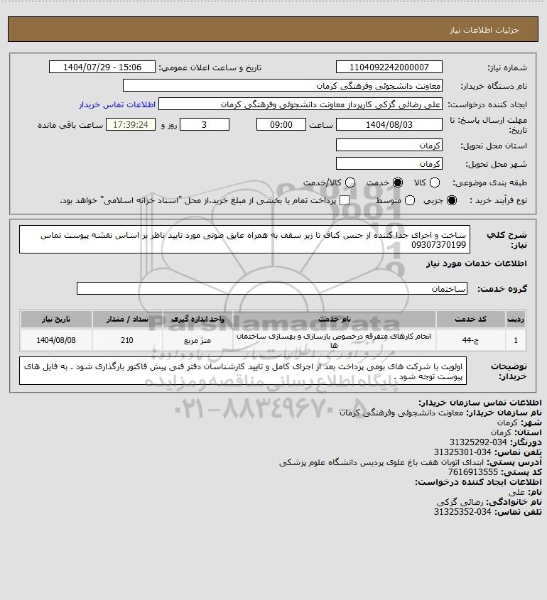 شرح کلی نیاز: ساخت و اجرای جدا کننده از جنس کناف تا زیر سقف به همراه عایق صوتی مورد تایید ناظر بر اساس نقشه پیوست