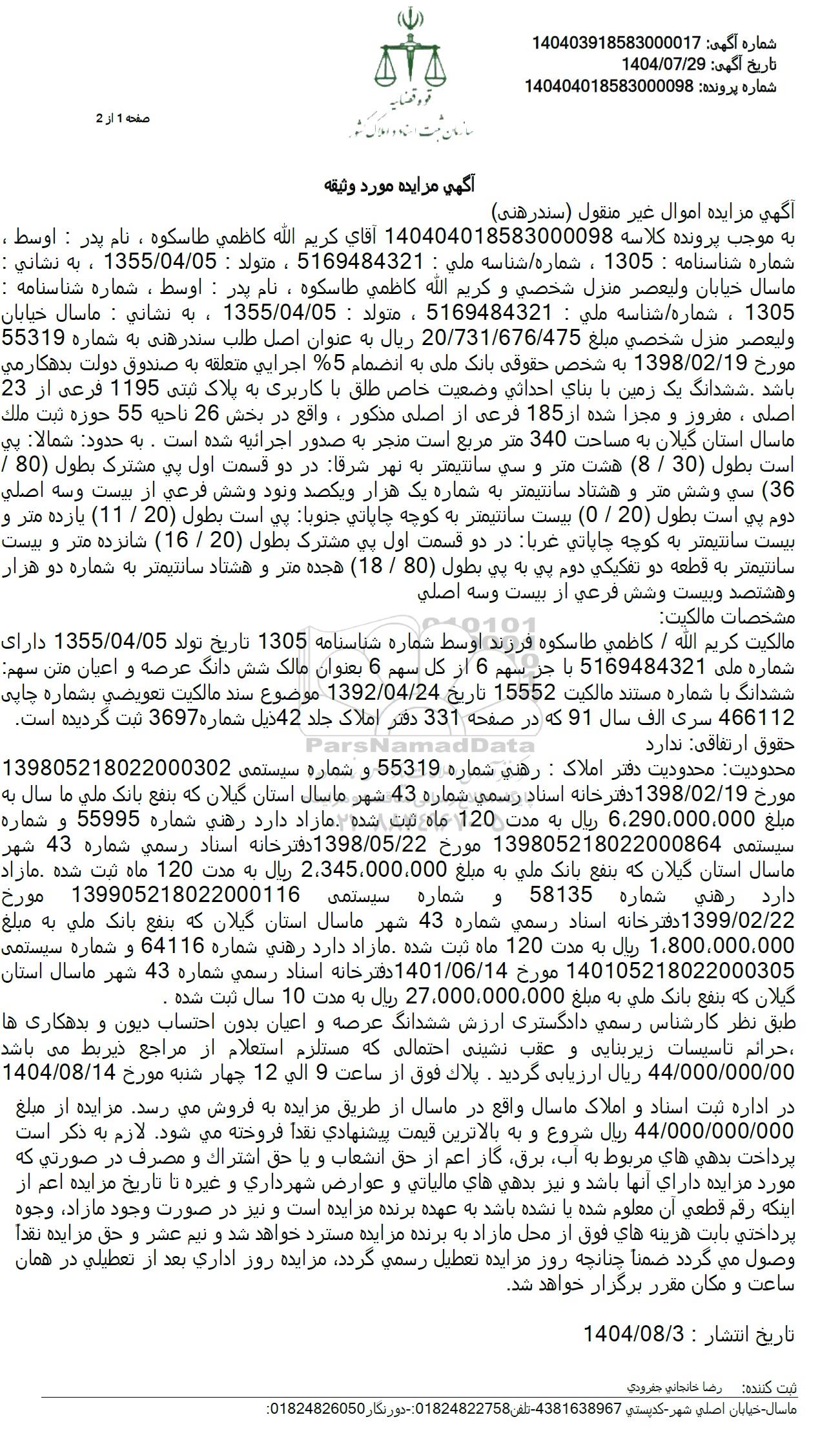 1305 ، شماره شناسه ملي : 5169484321، متولد : 1355.04.05، به نشاني : ماسال خیابان وليعصر منزل شخصي مبلغ 20.731.676.475 ریال به عنوان اصل طلب سندرهنی به شماره 55319 مورخ 1398.02.19 به شخص حقوقی بانک ملی به انضمام %5% اجرایی متعلقه به صندوق دولت بدهکار می باشد . ششدانگ یک زمین با بنای احداثی وضعیت خاص طلق با کاربری به پلاک ثبتی 1195 فرعی از 23 اصلی ، مفرور و مجرا شده از 185 فرعی از اصلی مذکور ، واقع در بخش 26 ناحيه 55 حوزه ثبت ملك ماسال استان گیلان به مساحت 340 متر مربع است منجر به صدور اجرائیه شده است . به حدود شمالا بی است بطول (30) / (8) هشت متر و سی سانتیمتر به نهر شرقا در دو قسمت اول پي مشترك بطول (80) /(36) سي و شش متر و هشتاد سانتیمتر به شماره یک هزار و یکصد و نود و شش فرعی از بیست و سه اصلي دوم بی است بطول (20) / (0) بیست سانتیمتر به کوچه چاپانی جنوبا پي است بطول 20 / 11) یازده متر و بیست سانتیمتر به کوچه چاپاتی غربا در دو قسمت اول پي مشترك بطول 20 / 16 شانزده متر و بیست سانتیمتر به قطعه دو تفكيكي دوم پي به پي بطول 80 / 18) هجده متر و هشتاد سانتیمتر به شماره دو هزار و هشتصد و بیست و شش فرعی از بیست و سه اصلی