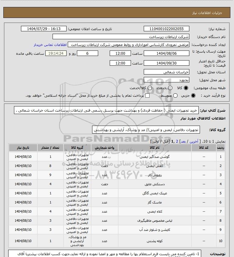 شرح کلی نیاز: خرید تجهیزات ایمنی ( حفاظت فردی) و بهداشت جهت پرسنل رسمی فنی ارتباطات زیرساخت استان خراسان شمالی .