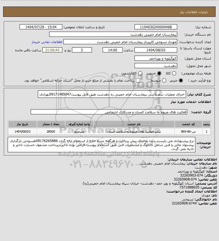 شرح کلی نیاز: اجرای عملیات سم پاشی بیمارستان امام خمینی ره دهدشت طبق فایل پیوست09171485047بهزادی