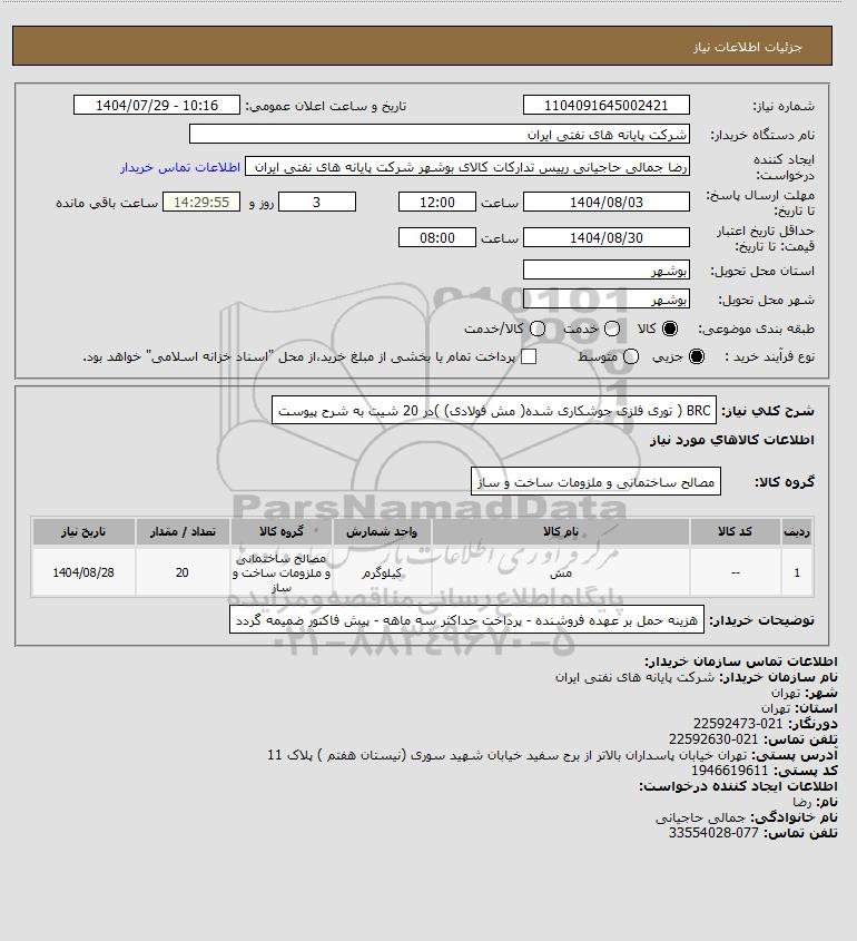 شرح کلی نیاز: BRC ( توری فلزی جوشکاری شده( مش فولادی) )در 20 شیت به شرح پیوست