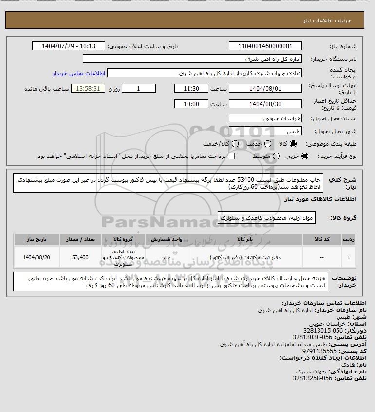 شرح کلی نیاز: چاپ مطبوعات طبق لیست 53400 عدد