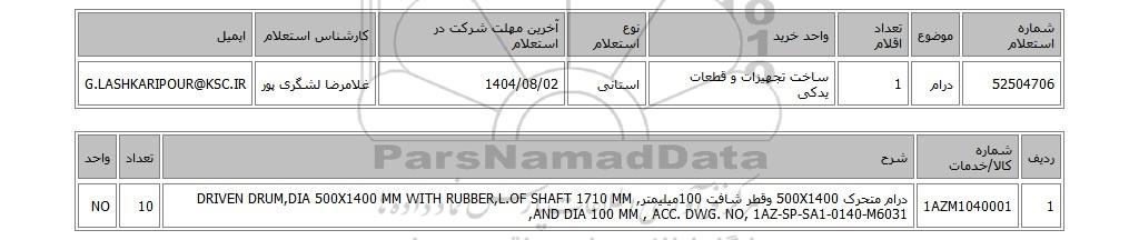 52504706درام1ساخت تجهیزات و قطعات یدکیاستانی1404/08/02غلامرضا لشگری پورG.LASHKARIPOUR@KSC.IR