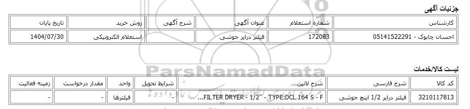 | احسان چابوک - 05141522291 | 172083 | فیلتر درایر جوشی | استعلام الکترونیکی | 1404/07/30 |