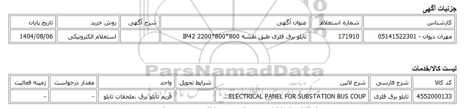 | مهران دیوان - 05141522301 | 171910 | تابلو برق فلزی طبق نقشه 800*800*2200 IP42 | استعلام الکترونیکی | 1404/08/06 |