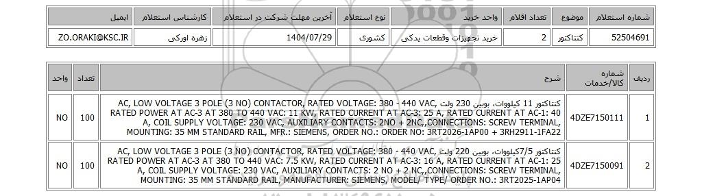 | 52504691 | کنتاکتور | 2 | خرید تجهیزات وقطعات یدکی | کشوری | 1404/07/29 | زهره اورکی | ZO.ORAKI@KSC.IR |