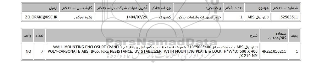 52503511تابلو برق ABS1خرید تجهیزات وقطعات یدکیکشوری1404/07/29زهره اورکیZO.ORAKI@KSC.IR