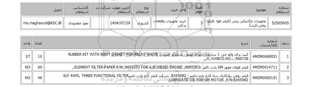 52505005تجهیزات مکانیکی ریلی (فیلتر هوا ،فیلتر روغن،کیت)3خرید تجهیزات وقطعات یدکیکشوری1404/07/29محمد مقصودیmo.maghsoudi@KSC.IR