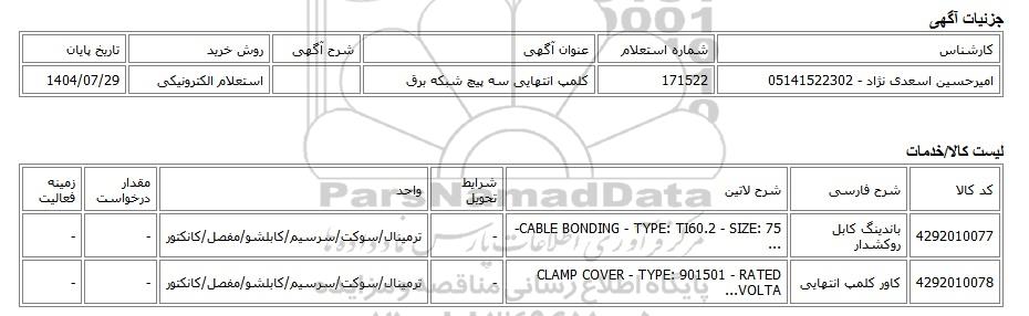 امیرحسین اسعدی نژاد - 05141522302 | 171522 | کلمپ انتهایی سه پیچ شبکه برق | استعلام الکترونیکی | 1404/07/29 |
