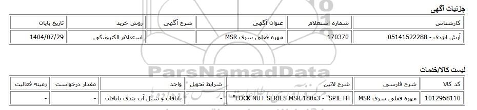 آرش ایزدی - 05141522288 | 170370 | مهره قفلی سری MSR | استعلام الکترونیکی | 1404/07/29 |