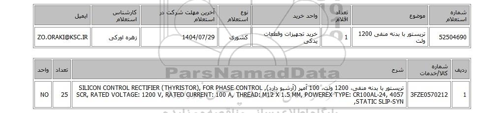 استعلام تریستور با بدنه منفی 1200 ولت, استعلام تریستور با بدنه منفی 1200 ولت