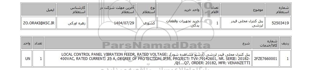 52503419 | پنل کنترل محلی فیدر لرزشی | 1 | خرید تجهیزات وقطعات یدکی | کشوری | 1404/07/29 | زهره اورکی | ZO.ORAKI@KSC.IR |