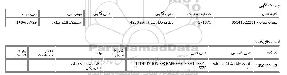 استعلام الکترونیکی باطری قابل شارژ 4200mAh, استعلام الکترونیکی، باطری قابل شارژ 4200mAh