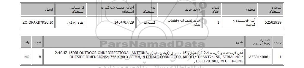 52503939آنتن فرستنده و گیرنده 1خرید تجهیزات وقطعات یدکیکشوری1404/07/29زهره اورکیZO.ORAKI@KSC.IR