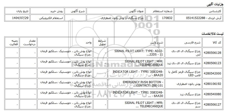 آرش ایزدی - 05141522288170832چراغ سیگنال و پوش باتون اضطراریاستعلام الکترونیکی1404/07/29