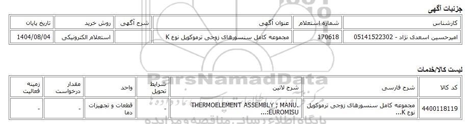امیرحسین اسعدی نژاد - 05141522302170618مجموعه کامل سنسورهای زوجی ترموکوپل نوع Kاستعلام الکترونیکی1404/08/04