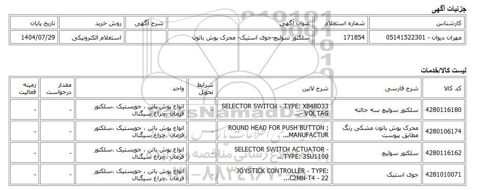 | مهران دیوان - 05141522301 | 171854 | سلکتور سوئیچ-جوی استیک- محرک پوش باتون | استعلام الکترونیکی | 1404/07/29 |