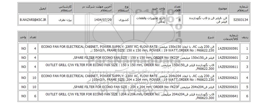 52503134 | فن ،فیلتر فن و قاب نگهدارنده فیلتر فن | 6 | خرید تجهیزات وقطعات یدکی | کشوری | 1404/07/29 | بیژن نظری | B.NAZARI@KSC.IR |
