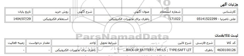 علی ناصرنیا - 05141522299 | 171022 | باطری برای تجهیزات الکترونیکی | استعلام الکترونیکی | 1404/07/29 |