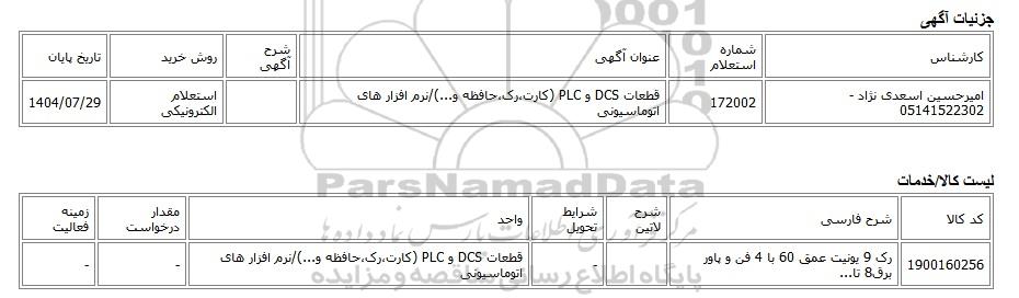 امیرحسین اسعدی نژاد - 05141522302172002قطعات DCS و PLC (کارت،رک،حافظه و...)/نرم افزار های اتوماسیونیاستعلام الکترونیکی1404/07/29