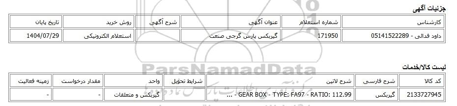 داود فدائی - 05141522289171950گیربکس پارس گرجی صنعتاستعلام الکترونیکی1404/07/29