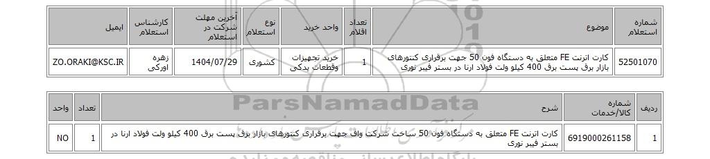 52501070کارت اترنت FE متعلق به دستگاه فون 50 جهت برقراری کنتورهای بازار برق پست برق 400 کیلو ولت فولاد ارنا در بستر فیبر نوری1خرید تجهیزات وقطعات یدکیکشوری1404/07/29زهره اورکیZO.ORAKI@KSC.IR