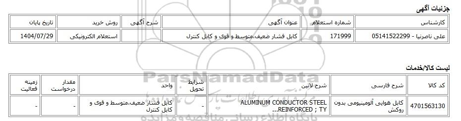 علی ناصرنیا - 05141522299 | 171999 | کابل فشار ضعیف،متوسط و قوی و کابل کنترل | استعلام الکترونیکی | 1404/07/29 |