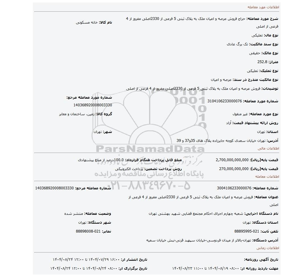 | قیمت پایه(ریال): 270,000,000,000 | روش پرداخت تضمین: پرداخت الکترونیکی |
