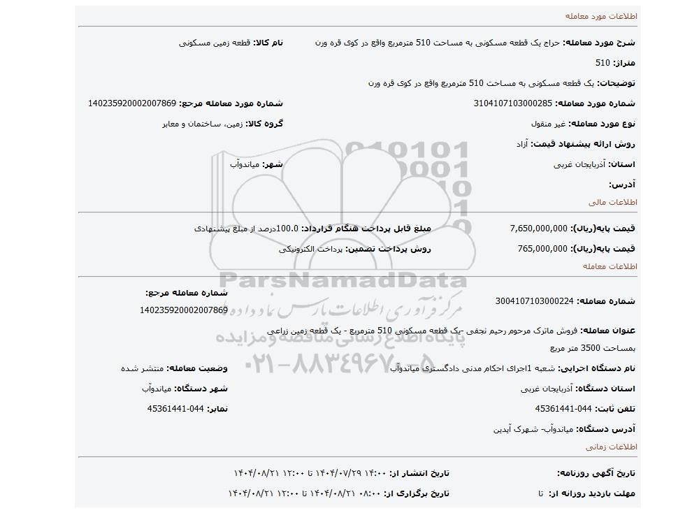 | شرح مورد معامله: حراج یک قطعه مسکونی به مساحت 510 مترمربع واقع در کوی قره ورن | نام کالا: قطعه زمین مسکونی | |