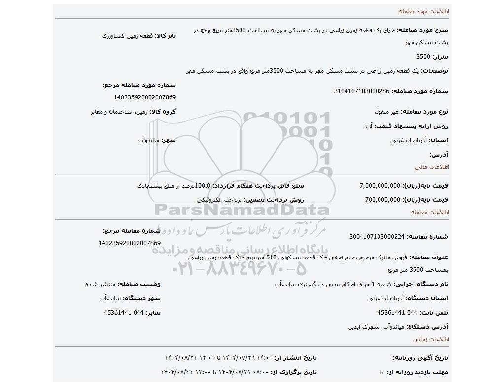 | شرح مورد معامله: حراج یک قطعه زمین زراعی در پشت مسکن مهر به مساحت 3500متر مربع واقع در پشت مسکن مهر | نام کالا: قطعه زمین کشاورزی | |