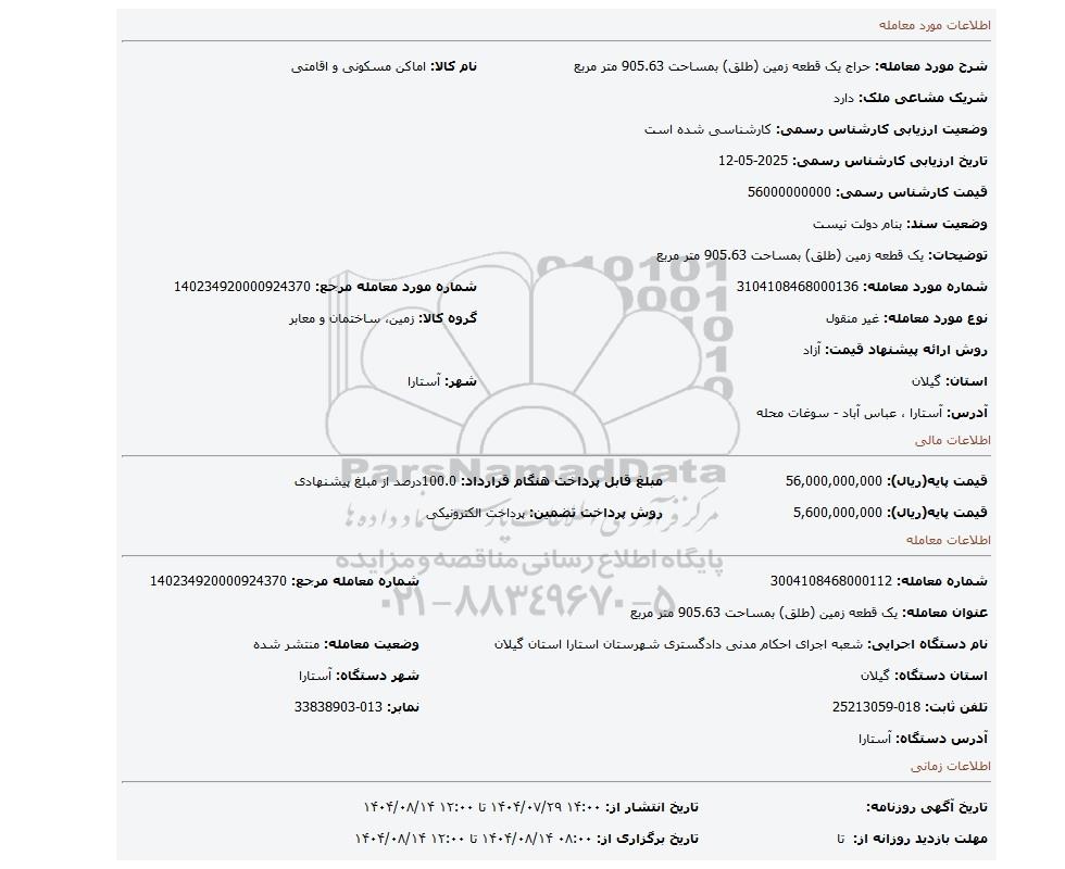 مزایده عمومی مزایده یک قطعه زمین (طلق) بمساحت 905.63 متر مربع برگزار میگردد. از کلیه افراد متخصص و شرکتهای واجد شرایط دعوت به عمل میآید تا در این مزایده با کد خبرگزاری پارس نماد : 9735165 شرکت نمایند تاریخ شروع مزایده : 1404/07/29 مهلت شرکت در مزایده: تا پایان روز 1404/08/14 مکان برگزاری اموال واگذاری استانهای گیلان و دستهبندیهای مربوط به این حراجی املاک و زمین میباشد.