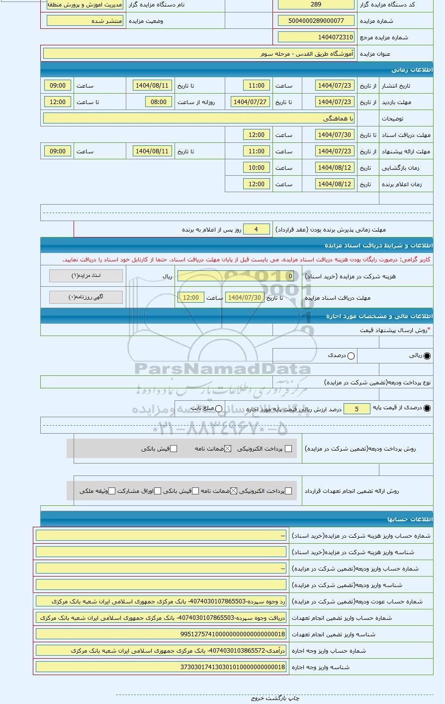 | عنوان مزایده | آموزشگاه طریق القدس - مرحله سوم | |||