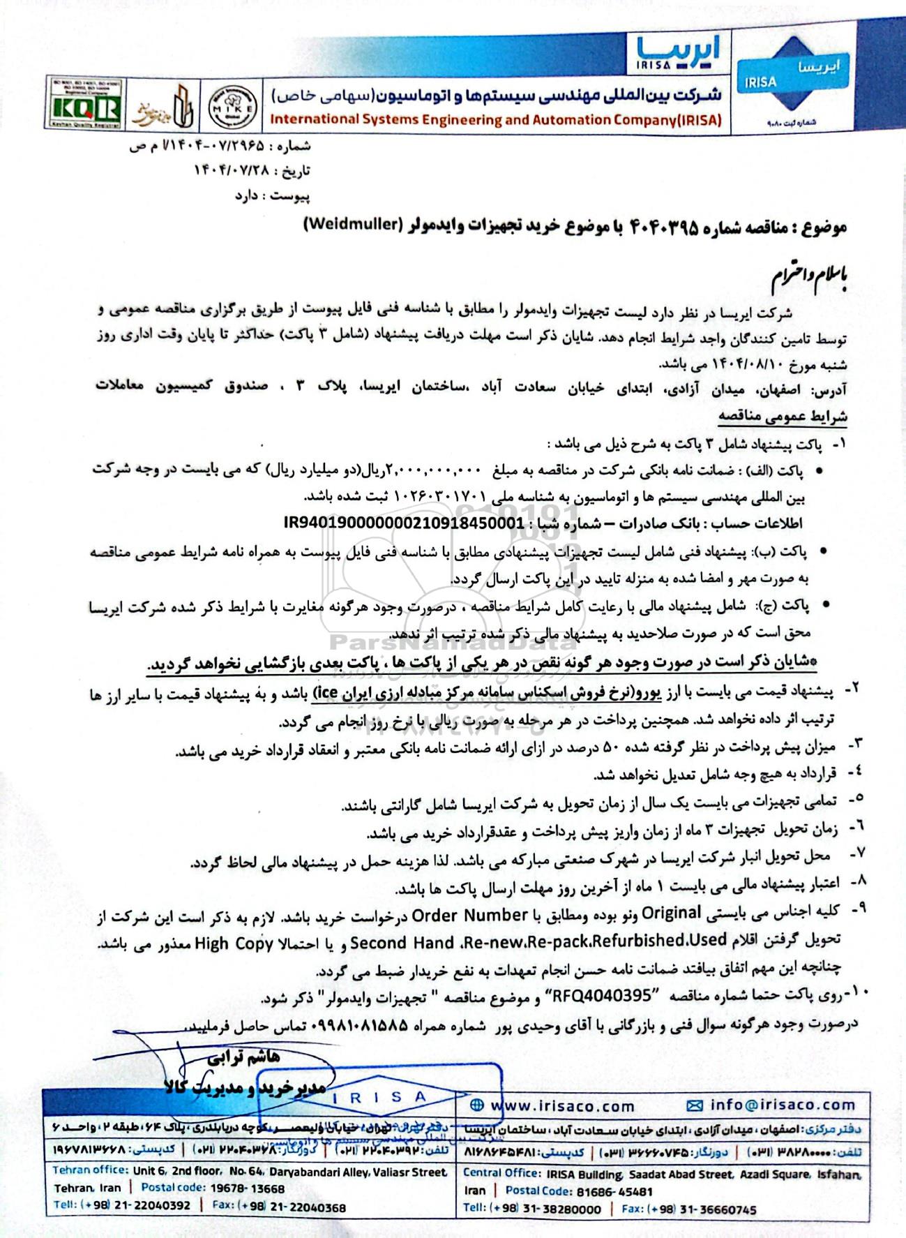 شرکت ایریسا در نظر دارد لیست تجهیزات وایدمولر را مطابق با شناسه فنی فایل پیوست از طریق برگزاری مناقصه عمومی و توسط تامین کنندگان واجد شرایط انجام دهد. شایان ذکر است مهلت دریافت پیشنهاد (شامل 3 پاکت) حداکثر تا پایان وقت اداری روز شنبه مورخ 1404.08.10 می باشد.