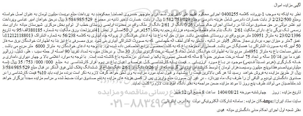 نظر به اینکه به موجب 1-پرونده کلاسه 0400255 اجرایی محکوم علیهم علی اکبر پور شجاعی و منوچهر خسروی تضامنا محکومند به پرداخت مبلغ دویست میلیون تومان به عنوان اصل خواسته ومبلغ 2/232/500 از بابت خسارات دادرسی شامل هزینه دادرسی ومبلغ 1/582/753/029 ریال از بابت خسارت تاخیر تادیه در مجموع 3/584/985/529 ریال درحق خواهان امیر عباسی وپرداخت نیم عشر دولتی در حق صندوق دولت لذا در راستای اجرای حکم صادره 0/26 دانگ از 2/61 دانگ از ملک واقع در محدوده اراضی روستای خطب از توابع بخش مرکزی شهرستان میانه دارای سند رسمی تک برگی باغ، دارای مالکیت 2/61 دانگ بنام خانم فاطمه مرضیهء فرزند رحیم به پلاک 157فرعی از 50اصلی از بخش 41تبریزتحت ورق مالکیت به شماره 380185الف/95 به تاریخ 23/02/1396 به متراژ 10951 متر مربع واقع در روستای خطب می باشد. میزان حق آبه باغ بنا به ادعای خواندگان از پروانه چاه آبیاری به کلاسه 56/238 به شماره اشتراک 112121188013با عمق 7متر و میزان بهره برداری مجاز حداکثر 5لیتر در ثانیه ، متعلق به آقای لطف اله طهماسبی که به صورت اشتراکی آبیاری می شود .برق مصرفی باغ نیز بنا به اظهارات خواندگان برق سه فاز 50 آمپر که به صورت اشتراکی با همسایگان می باشد. قسمتی از محوطه باغ که به کشت محصول برنج اختصاص داده شده بود. با توجه به ادعای خواندگان به متراژ 6000 متر مربع می باشد . مابقی مساحت باغ به متراژ 4951متر مربع بنا به اظهارات خواندگان شامل تعداد 5 اصله درخت گردوی بیش از 30 سال و درختان میوه به تعداد تقریباً 90 اصله از جمله سیب ، هلو، شلیل، زرالوو غیره ما بین 4تا 10 ساله و تعداد 75 اصله درخت صنوبر حدوداً 8 ساله که قسمتی بصورت یکجا و تعدادی در حاشیه باغ کاشته شده است. با توجه به موارد اعلامی بالا و چهار دیواری دامداری و خانه کارگری (هردو نسبتاً قدیمی) موجود در باغ مورد ارزیابی ، قیمت پایه کارشناسی کل عرصه و اعیان باغ در یوم قرار کارشناسی به مبلغ 000/ 000/ 753/ 35 ریال (سه میلیاردوپانصدوهفتادوپنج میلیون وسیصدهزار تومان ) توسط کارشناس ارزیابی گردیده که از آن 0/26 دانگ از 2/61 دانگ مشاع از ششدانگ پلاک ثبتی فوق الذکر در قبال مبلغ 3/584/985/529 ریال از طریق مزایده به فروش خواهد رسید لذا هر کس بالاترین قیمت را پیشنهاد و قبول نماید مورد مزایده به وی تعلق خواهد گرفت لازم به ذکر است برنده مزایده باید 10% قیمت کارشناسی را در صندوق دادگستری تودیع و الباقی آن را ظرف یک ماه بپردازد ، در غیر این صورت مبلغ واریزی پس از کسر هزینه های مزایده به نفع صندوق دولت ضبط شده و مراسم مزایده مجدداً برگزار خواهد شد.متقاضیان می توانند ظرف پنج روز تا موعد مزایده ضمن مراجعه به دفتر دادگاه اطلاعات لازم را کسب نمایند.