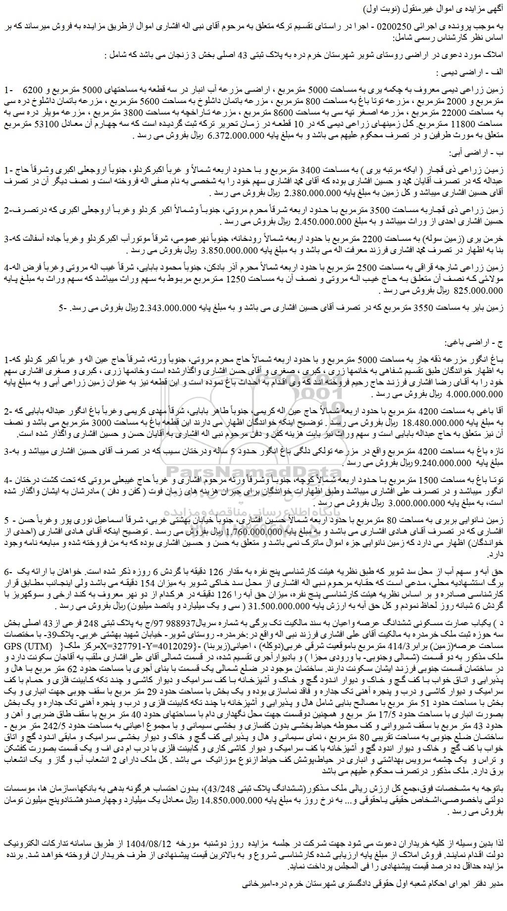 به موجب پرونده ی اجرائی 0200250 - اجرا در راستای تقسیم ترکه متعلق به مرحوم آقای نبی اله افشاری اموال ازطریق مزایده به فروش میرساند که بر اساس نظر کارشناس رسمی شامل: