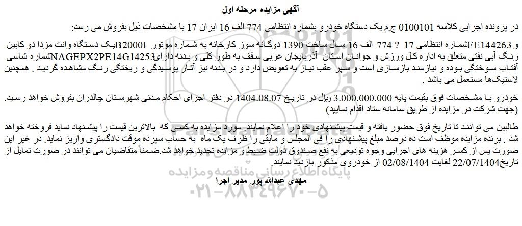 در پرونده اجرایی کلاسه 0100101 ج.م یک دستگاه خودرو بشماره انتظامی 774 الف 16 ایران 17 با مشخصات ذیل بفروش می رسد: