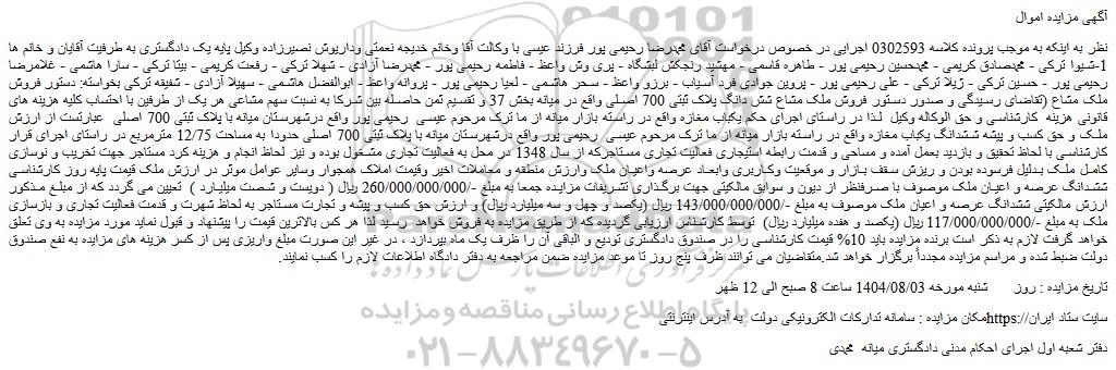 نظر به اینکه به موجب پرونده کلاسه 0302593 اجرایی در خصوص درخواست آقای محمدرضا رحیمی پور فرزند عیسی با وکالت آقا وخانم خدیجه نعمتی وداریوش نصیرزاده وکیل پایه یک دادگستری به طرفیت آقایان و خانم ها 1-شیوا ترکی - محمدصادق کریمی - محمدحسین رحیمی پور - طاهره قاسمی - مهشید رنجکش لبشگاه - پری وش واعظ - فاطمه رحیمی پور - محمدرضا آزادی - شهلا ترکی - رفعت کریمی - بیتا ترکی - سارا هاشمی - غلامرضا رحیمی پور - حسین ترکی - ژیلا ترکی - علی رحیمی پور - پروین جوادی فرد آسیاب - برزو واعظ - سحر هاشمی - لعیا رحیمی پور - پروانه واعظ - ابوالفضل هاشمی - سهیلا آزادی - شفیقه ترکی بخواسته: دستور فروش ملک مشاع (تقاضای رسیدگی و صدور دستور فروش ملک مشاع شش دانگ پلاک ثبتی 700 اصلی واقع در میانه بخش 37 و تقسیم ثمن حاصله بین شرکا به نسبت سهم مشاعی هر یک از طرفین با احتساب کلیه هزینه های قانونی هزینه کارشناسی و حق الوکاله وکیل لذا در راستای اجرای حکم یکباب مغازه واقع در راسته بازار میانه از ما ترک مرحوم عیسی رحیمی پور واقع درشهرستان میانه با پلاک ثبتی 700 اصلی عبارتست از ارزش ملک و حق کسب و پیشه ششدانگ یکباب مغازه واقع در راسته بازار میانه از ما ترک مرحوم عیسی رحیمی پور واقع درشهرستان میانه با پلاک ثبتی 700 اصلی حدودا به مساحت 12/75 مترمربع در راستای اجرای قرار کارشناسی با لحاظ تحقیق و بازدید بعمل آمده و مساحی و قدمت رابطه استیجاری فعالیت تجاری مستاجرکه از سال 1348 در محل به فعالیت تجاری مشغول بوده و نیز لحاظ انجام و هزینه کرد مستاجر جهت تخریب و نوسازی کامل ملک بدلیل فرسوده بودن و ریزش سقف بازار و موقعیت وکاربری وابعاد عرصه واعیان ملک وارزش منطقه و معاملات اخیر وقیمت املاک همجوار وسایر عوامل موثر در ارزش ملک قیمت پایه روز کارشناسی ششدانگ عرصه و اعیان ملک موصوف با صرفنظر از دیون و سوابق مالکیتی جهت برگذاری تشریفات مزایده جمعا به مبلغ -/260/000/000/000 ریال ( دویست و شصت میلیارد ) تعیین می گردد که از مبلغ مذکور ارزش مالکیتی ششدانگ عرصه و اعیان ملک موصوف به مبلغ -/143/000/000/000 ریال (یکصد و چهل و سه میلیارد ریال) و ارزش حق کسب و پیشه و تجارت مستاجر به لحاظ شهرت و قدمت فعالیت تجاری و بازسازی ملک به مبلغ -/117/000/000/000 ریال (یکصد و هفده میلیارد ریال) توسط کارشناس ارزیابی گردیده که از طریق مزایده به فروش خواهد رسید لذا هر کس بالاترین قیمت را پیشنهاد و قبول نماید مورد مزایده به وی تعلق خواهد گرفت لازم به ذکر است برنده مزایده باید 10% قیمت کارشناسی را در صندوق دادگستری تودیع و الباقی آن را ظرف یک ماه بپردازد ، در غیر این صورت مبلغ واریزی پس از کسر هزینه های مزایده به نفع صندوق دولت ضبط شده و مراسم مزایده مجدداً برگزار خواهد شد.متقاضیان می توانند ظرف پنج روز تا موعد مزایده ضمن مراجعه به دفتر دادگاه اطلاعات لازم را کسب نمایند.