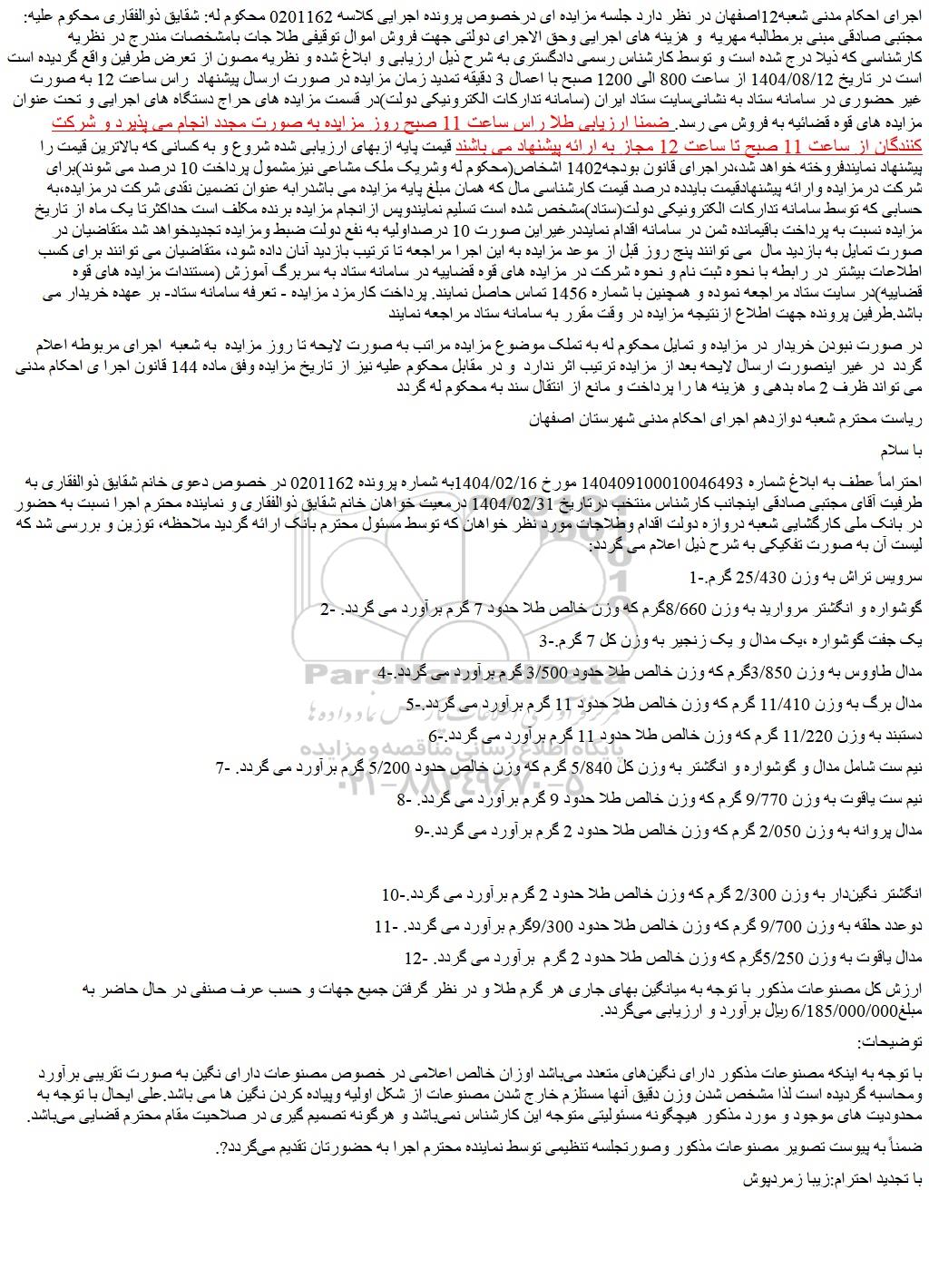 اجرای احکام مدنی شعبه12اصفهان در نظر دارد جلسه مزایده ای درخصوص پرونده اجرایی کلاسه 0201162 محکوم له: شقایق ذوالفقاری محکوم علیه: مجتبی صادقی مبنی برمطالبه مهریه  و هزینه های اجرایی وحق الاجرای دولتی جهت فروش اموال توقیفی طلا جات بامشخصات مندرج در نظریه کارشناسی که ذیلا درج شده است و توسط کارشناس رسمی دادگستری به شرح ذیل ارزیابی و ابلاغ شده و نظریه مصون از تعرض طرفین واقع گردیده است است در تاریخ 1404/08/12 از ساعت 800 الی 1200 صبح با اعمال 3 دقیقه تمدید زمان مزایده در صورت ارسال پیشنهاد  راس ساعت 12 به صورت غیر حضوری در سامانه ستاد به نشانیسایت ستاد ایران (سامانه تدارکات الکترونیکی دولت)در قسمت مزایده های حراج دستگاه های اجرایی و تحت عنوان مزایده های قوه قضائیه به فروش می رسد. ضمنا ارزیابی طلا راس ساعت 11 صبح روز مزایده به صورت مجدد انجام می پذیرد و شرکت کنندگان از ساعت 11 صبح تا ساعت 12 مجاز به ارائه پیشنهاد می باشند قیمت پایه ازبهای ارزیابی شده شروع و به کسانی که بالاترین قیمت را پیشنهاد نمایندفروخته خواهد شد،دراجرای قانون بودجه1402 اشخاص(محکوم له وشریک ملک مشاعی نیزمشمول پرداخت 10 درصد می شوند)برای شرکت درمزایده وارائه پیشنهادقیمت بایدده درصد قیمت کارشناسی مال که همان مبلغ پایه مزایده می باشدرابه عنوان تضمین نقدی شرکت درمزایده،به حسابی که توسط سامانه تدارکات الکترونیکی دولت(ستاد)مشخص شده است تسلیم نمایندوپس ازانجام مزایده برنده مکلف است حداکثرتا یک ماه از تاریخ مزایده نسبت به پرداخت باقیمانده ثمن در سامانه اقدام نمایددرغیراین صورت 10 درصداولیه به نفع دولت ضبط ومزایده تجدیدخواهد شد متقاضیان در صورت تمایل به بازدید مال  می توانند پنج روز قبل از موعد مزایده به این اجرا مراجعه تا ترتیب بازدید آنان داده شود، متقاضیان می توانند برای کسب اطلاعات بیشتر در رابطه با نحوه ثبت نام و نحوه شرکت در مزایده های قوه قضاییه در سامانه ستاد به سربرگ آموزش (مستندات مزایده های قوه قضاییه)در سایت ستاد مراجعه نموده و همچنین با شماره 1456 تماس حاصل نمایند. پرداخت کارمزد مزایده - تعرفه سامانه ستاد- بر عهده خریدار می باشد.طرفین پرونده جهت اطلاع ازنتیجه مزایده در وقت مقرر به سامانه ستاد مراجعه نمایند