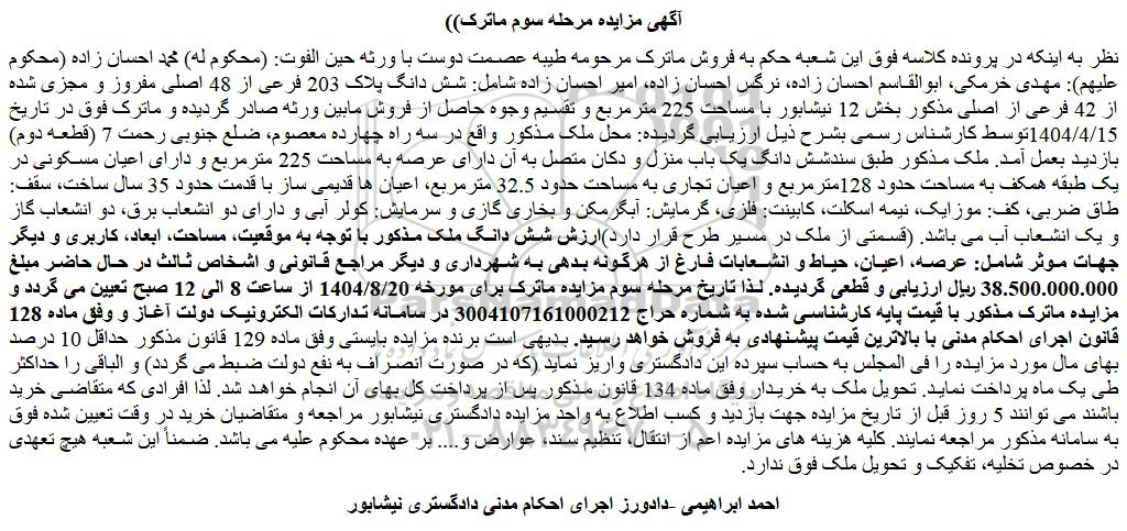 نظر به اینکه در پرونده کلاسه فوق این شعبه حکم به فروش ماترک مرحومه طیبه عصمت دوست با ورثه حین الفوت: (محکوم له) محمد احسان زاده (محکوم علیهم): مهدی خرمکی، ابوالقاسم احسان زاده، نرگس احسان زاده، امیر احسان زاده شامل: شش دانگ پلاک 203 فرعی از 48 اصلی مفروز و مجزی شده از 42 فرعی از اصلی مذکور بخش 12 نیشابور با مساحت 225 مترمربع و تقسیم وجوه حاصل از فروش مابین ورثه صادر گردیده و ماترک فوق در تاریخ 1404/4/15توسط کارشناس رسمی بشرح ذیل ارزیابی گردیده: محل ملک مذکور واقع در سه راه چهارده معصوم، ضلع جنوبی رحمت 7 (قطعه دوم) بازدید بعمل آمد. ملک مذکور طبق سندشش دانگ یک باب منزل و دکان متصل به آن دارای عرصه به مساحت 225 مترمربع و دارای اعیان مسکونی در یک طبقه همکف به مساحت حدود 128مترمربع و اعیان تجاری به مساحت حدود 32.5 مترمربع، اعیان ها قدیمی ساز با قدمت حدود 35 سال ساخت، سقف: طاق ضربی، کف: موزایک، نیمه اسکلت، کابینت: فلزی، گرمایش: آبگرمکن و بخاری گازی و سرمایش: کولر آبی و دارای دو انشعاب برق، دو انشعاب گاز و یک انشعاب آب می باشد. (قسمتی از ملک در مسیر طرح قرار دارد)ارزش شش دانگ ملک مذکور با توجه به موقعیت، مساحت، ابعاد، کاربری و دیگر جهات موثر شامل: عرصه، اعیان، حیاط و انشعابات فارغ از هرگونه بدهی به شهرداری و دیگر مراجع قانونی و اشخاص ثالث در حال حاضر مبلغ 38.500.000.000 ریال ارزیابی و قطعی گردیده. لذا تاریخ مرحله سوم مزایده ماترک برای مورخه 1404/8/20 از ساعت 8 الی 12 صبح تعیین می گردد و مزایده ماترک مذکور با قیمت پایه کارشناسی شده به شماره حراج 3004107161000212 در سامانه تدارکات الکترونیک دولت آغاز و وفق ماده 128 قانون اجرای احکام مدنی با بالاترین قیمت پیشنهادی به فروش خواهد رسید. بدیهی است برنده مزایده بایستی وفق ماده 129 قانون مذکور حداقل 10 درصد بهای مال مورد مزایده را فی المجلس به حساب سپرده این دادگستری واریز نماید (که در صورت انصراف به نفع دولت ضبط می گردد) و الباقی را حداکثر طی یک ماه پرداخت نماید. تحویل ملک به خریدار وفق ماده 134 قانون مذکور پس از پرداخت کل بهای آن انجام خواهد شد. لذا افرادی که متقاضی خرید باشند می توانند 5 روز قبل از تاریخ مزایده جهت بازدید و کسب اطلاع به واحد مزایده دادگستری نیشابور مراجعه و متقاضیان خرید در وقت تعیین شده فوق به سامانه مذکور مراجعه نمایند. کلیه هزینه های مزایده اعم از انتقال، تنظیم سند، عوارض و.... بر عهده محکوم علیه می باشد. ضمناً این شعبه هیچ تعهدی در خصوص تخلیه، تفکیک و تحویل ملک فوق ندارد.