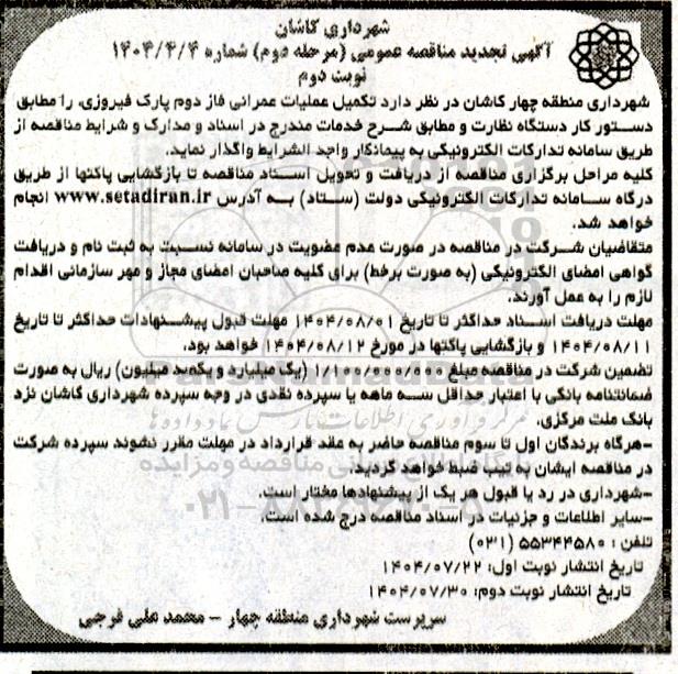 شهرداری منطقه چهار کاشان در نظر دارد تکمیل عملیات عمرانی فاز دوم پارک فیروزی، را مطابق دستور کار دستگاه نظارت و مطابق شرح خدمات مندرج در اسناد و مدارک و شرایط مناقصه و قرارداد منضم از طریق سامانه تدارکات الکترونیکی دولت به پیمانکار واجد الشرایط واگذار نماید.