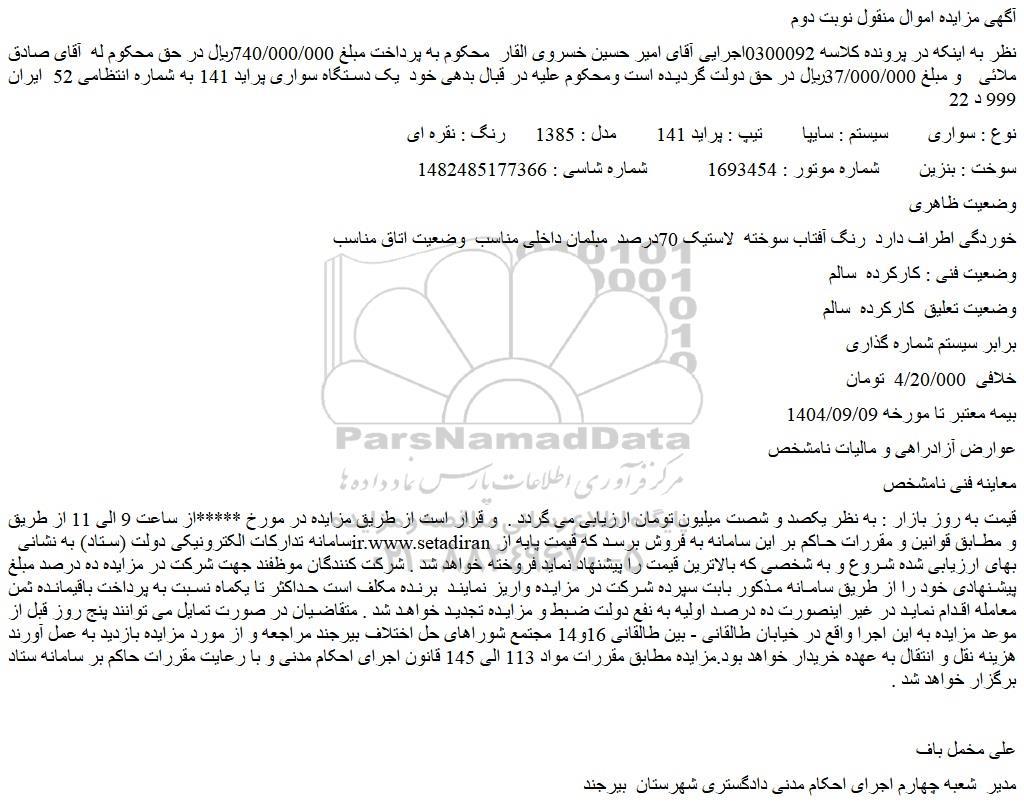 نظر به اینکه در پرونده کلاسه 0300092اجرایی آقای امیر حسین خسروی القار محکوم به پرداخت مبلغ 740/000/000ریال در حق محکوم له آقای صادق ملائی و مبلغ 37/000/000ریال در حق دولت گردیده است ومحکوم علیه در قبال بدهی خود یک دستگاه سواری پراید 141 به شماره انتظامی 52 ایران 999 د 22