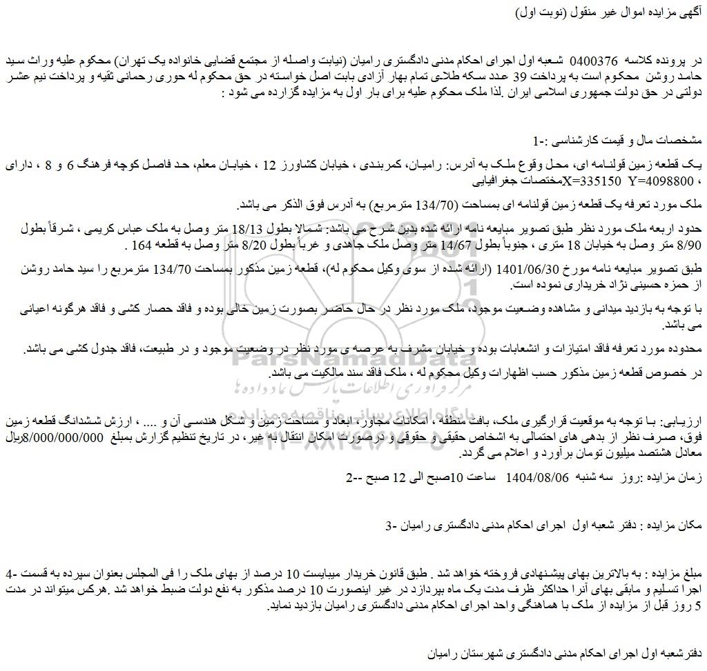 در پرونده کلاسه 0400376 شعبه اول اجرای احکام مدنی دادگستری رامیان (نیابت واصله از مجتمع قضایی خانواده یک تهران) محکوم علیه وراث سید حامد روشن محکوم است به پرداخت 39 عدد سکه طلای تمام بهار آزادی بابت اصل خواسته در حق محکوم له حوری رحمانی ثقیه و پرداخت نیم عشر دولتی در حق دولت جمهوری اسلامی ایران .لذا ملک محکوم علیه برای بار اول به مزایده گزارده می شود :