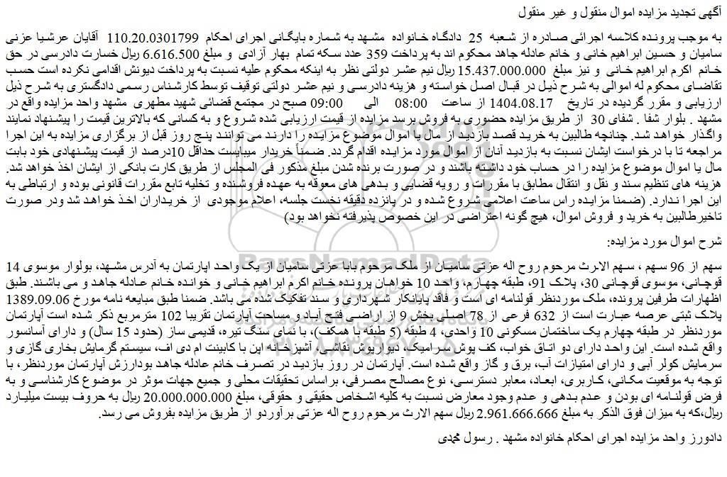 به موجب پرونده کلاسه اجرائی صادره از شعبه 25 دادگاه خانواده مشهد به شماره بایگانی اجرای احکام 110.20.0301799 آقایان عرشیا عزنی سامیان و حسین ابراهیم خانی و خانم عادله جاهد محکوم اند به پرداخت 359 عدد سکه تمام بهار آزادی و مبلغ 6.616.500 ریال خسارت دادرسی در حق خانم اکرم ابراهیم خانی و نیز مبلغ 15.437.000.000 ریال نیم عشر دولتی نظر به اینکه محکوم علیه نسبت به پرداخت دیونش اقدامی نکرده است حسب تقاضای محکوم له اموالی به شرح ذیل در قبال اصل خواسته و هزینه دادرسی و نیم عشر دولتی توقیف توسط کارشناس رسمی دادگستری به شرح ذیل ارزیابی و مقرر گردیده در تاریخ 1404.08.17 از ساعت 08:00 الی 09:00 صبح در مجتمع قضائی شهید مطهری مشهد واحد مزایده واقع در مشهد . بلوار شفا . شفای 30 از طریق مزایده حضوری به فروش برسد مزایده از قیمت ارزیابی شده شروع و به کسانی که بالاترین قیمت را پیشنهاد نمایند واگذار خواهد شد. چنانچه طالبین به خرید قصد بازدید از مال یا اموال موضوع مزایده را دارند می توانند پنج روز قبل از برگزاری مزایده به این اجرا مراجعه تا با درخواست ایشان نسبت به بازدید آنان از اموال مورد مزایده اقدام گردد. ضمناً خریدار میبایست حداقل 10درصد از قیمت پیشنهادی خود بابت مال یا اموال موضوع مزایده را در حساب خود داشته باشند و در صورت برنده شدن مبلغ مذکور فی المجلس از طریق کارت بانکی از ایشان اخذ خواهد شد. هزینه های تنظیم سند و نقل و انتقال مطابق با مقررات و رویه قضایی و بدهی های معوقه به عهده فروشنده و تخلیه تابع مقررات قانونی بوده و ارتباطی به این اجرا ندارد. (ضمنا مزایده راس ساعت اعلامی شروع شده و در پانزده دقیقه نخست جلسه، اعلام موجودی از خریداران اخذ خواهد شد ودر صورت تاخیرطالبین به خرید و فروش اموال، هیچ گونه اعتراضی در این خصوص پذیرفته نخواهد بود)