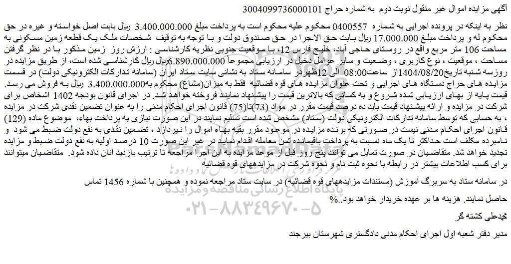 نظر به اینکه در پرونده اجرایی به شماره  0400557 محکوم علیه محکوم است به پرداخت مبلغ 3.400.000.000  ریال بابت اصل خواسته و غیره در حق محکوم له و پرداخت مبلغ 17.000.000 ریال بابت حق الاجرا در حق صندوق دولت و با توجه به توقیف  شخصات ملک یک قطعه زمین مسکونی به مساحت 106 متر مربع واقع در روستای حاجی آباد، خلیج فارس 12، با موقعیت جنوبی نظریه کارشناسی : ارزش روز  زمین مذکور با در نظر گرفتن مساحت ، موقعیت ، نوع کاربری ، وضعیت و سایر عوامل دخیل در ارزیابی مجموعاً 6.890.000.000ریال ریال کارشناسی شده است، از طریق مزایده در روزسه شنبه تاریخ1404/08/20از ساعت08:00 الی 12ظهردر سامانه ستاد به نشانی سایت ستاد ایران (سامانه تدارکات الکترونیکی دولت) در قسمت مزایده های حراج دستگاه های اجرایی و تحت عنوان مزایده های قوه قضائیه  فقط به میزان(مشاع) محکوم به3.400.000.000  ریال به فروش می رسد. قیمت پایه از بهای ارزیابی شده شروع و به کسانی که بالاترین قیمت را پیشنهاد نمایند فروخته خواهد شد. در اجرای قانون بودجه 1402 اشخاص برای شرکت در مزایده و ارائه پیشنهاد قیمت باید ده درصد قیمت مقرر در مواد (73)تا(75) قانون اجرای احکام مدنی را به عنوان تضمین نقدی شرکت در مزایده ، به حسابی که توسط سامانه تدارکات الکترونیکی دولت (ستاد) مشخص شده است تسلیم نمایند در این صورت نیازی به پرداخت بهاء،  موضوع ماده (129) قانون اجرای احکام مدنی نیست در صورتی که برنده مزایده در موعود مقرر بقیه بهاء اموال را نپردازد ، تضمین نقدی به نفع دولت ضبط می شود  و نامبرده مکلف است حداکثر تا یک ماه نسبت به پرداخت باقیمانده ثمن معامله اقدام نماید در غیر این صورت 10 درصد اولیه به نفع دولت ضبط و مزایده تجدید خواهد شد. متقاضیان در صورت تمایل می توانند پنج روز قبل از موعد مزایده به این اجرا مراجعه تا ترتیب بازدید آنان داده شود.  متقاضیان میتوانند برای کسب اطلاعات بیشتر در رابطه با نحوه ثبت نام و نحوه شرکت در مزایدههای قوه قضائیه