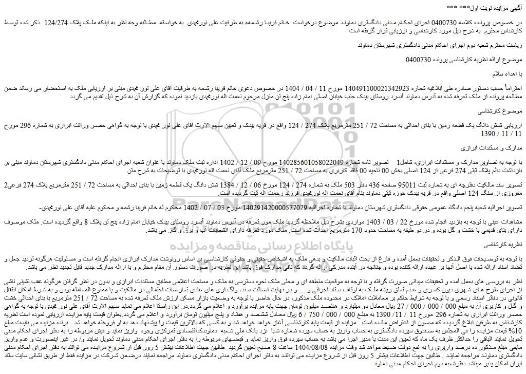 در خصوص پرونده کلاسه 0400730 اجرای احکام مدنی دادگستری دماوند موضوع درخواست خانم فریبا رشمهء به طرفیت علی نورمحمدی به خواسته مطالبه وجه نظر به اینکه ملک پلاک 124/274 ذکر شده توسط کارشناس محترم به شرح ذیل مورد کارشناسی و ارزیابی قرار گرفته است