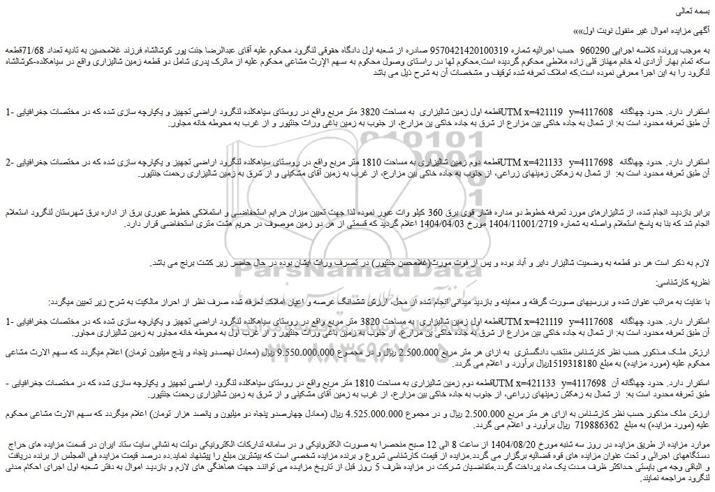 مزایده قطعه اول زمین شالیزاری  به مساحت 3820 متر مربع, مزایده قطعه اول زمین شالیزاری  به مساحت 3820 متر مربع